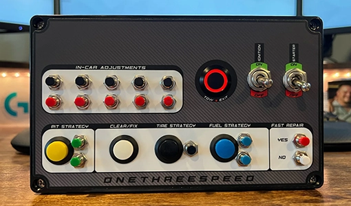 The button layout is extremely important - we've laid out the buttons in clusters with specific order to ensure the racer would always be able to make a change to the car or execute a pit strategy without taking their eyes off of the screen. Even drivers leveraging a VR headset can quickly learn the button layout by touch and manage their vehicle seamlessly.